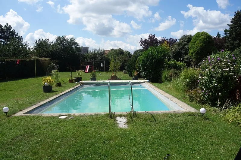 Ausstattung: 2021 wurde der Innenbereich der Immobilie liebevoll saniert. Wände, Fußböden, Türen, Elektrik, Heizung u. Bad im OG In der Küche und in der Dusche im OG gibt es eine Fußbodenheizung. Die moderne EBK ist inklusive. Außerdem gibt es eine große Garage mit elektrischem Tor, eine Zufahrt, eine Sommerküche, einen überdachten Sitzplatz und einem großzügigen Garten mit luxuriösem Pool