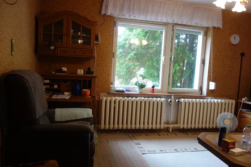 Ausstattung Isolierglasfenster, moderne Heizung, moderne, neue Dusche, Fußböden überwiegend Laminat, im Wohnzimmer Teppich, Bad Fliesen, Fassade saniert mit Dämmung und Außenputz, Wohnzimmer mit angrenzendem Balkon, Dachboden, Keller